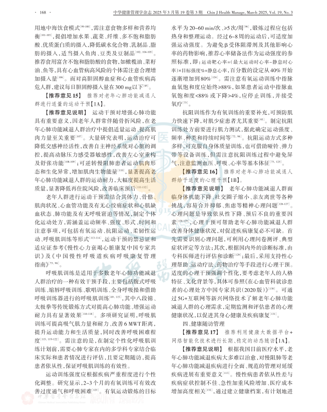 【推荐意见说明】 运动干预对增强心肺功能具有重要意义,因老年人群常伴随骨折风险,在老年心肺功能减退人群治疗中提倡适量运动、提高肌肉力量至关重要"。大量研究表明,运动治疗可降低交感神经活性,改善自主神经系统对心脏的调控,提高动脉压力感受器敏感性,改善左心室重构及舒张功能""";可逆转慢阻肺患者运动肌肉形态和生化异常,增加肌肉生物能量"",显著提高老年心肺功能减退人群的运动耐力,大幅度提高生活质量,显著降低再住院风险,改善临床预后""。