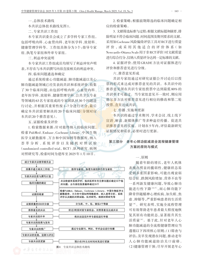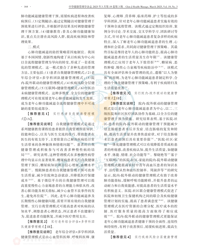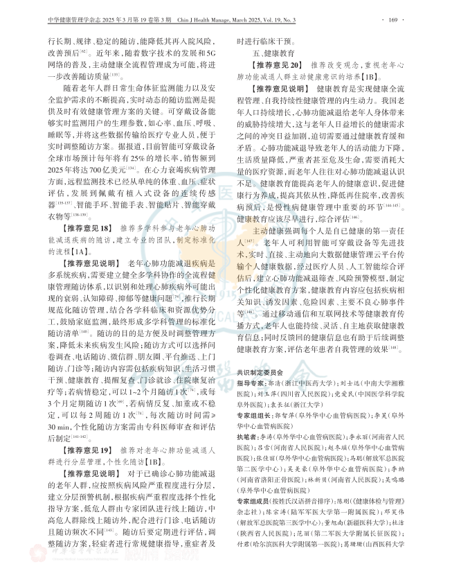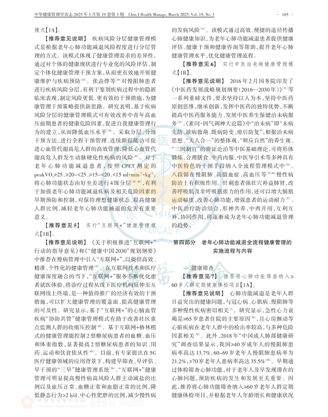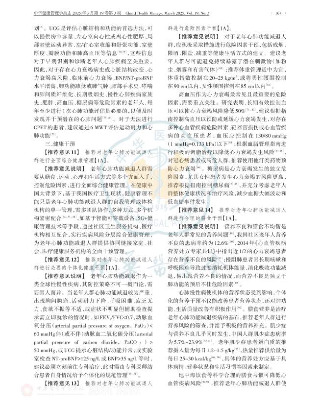 老年心肺功能健康是指老年人的心血管系统和呼吸系统具有良好的适应持续体力消耗的能力,无心肺功能障碍导致的活动受限或呼吸困难等症状。其评价标准包括:6min步行试验(6minute walk test,6 MWT)距离达到经公式计算的预测标准"且经心肺运动试验(eardiopulmonary exercise lesting,CPET)测定的峰值摄氧量(peakVO2)>20ml-min'-kg'及无氧阀(anaerobic threshold.AT)>14ml·min·kg。